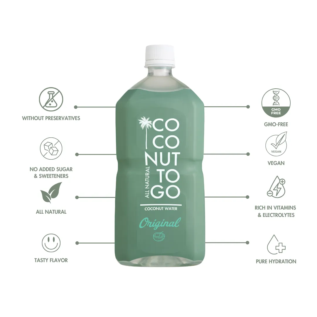Coconut to go ORIGINAL 100 % Reines Kokoswasser KISTE 12 x 1 Liter Vietnam There is probably no better and more intense tasting coconut water on the entire Swiss market than that of Coconut to go: it tastes as if you were cracking open a fresh...